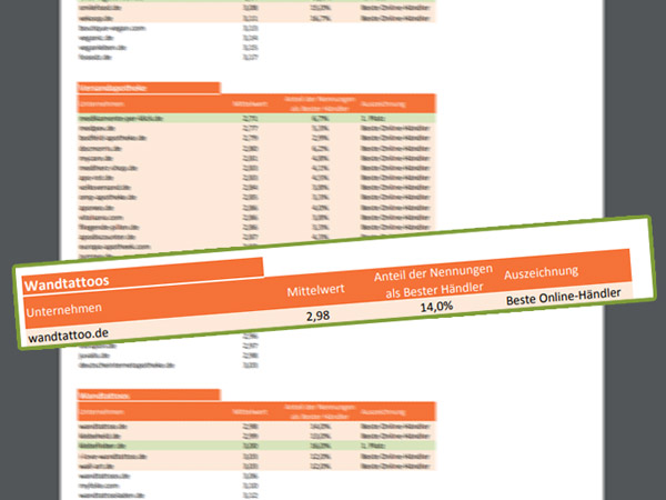 Wir freuen uns, dass unser Portal Wandtattoo.de in der Kategorie der Online-Händler in der Branche „Wandtattoos“ als herausragend ausgezeichnet wurde.