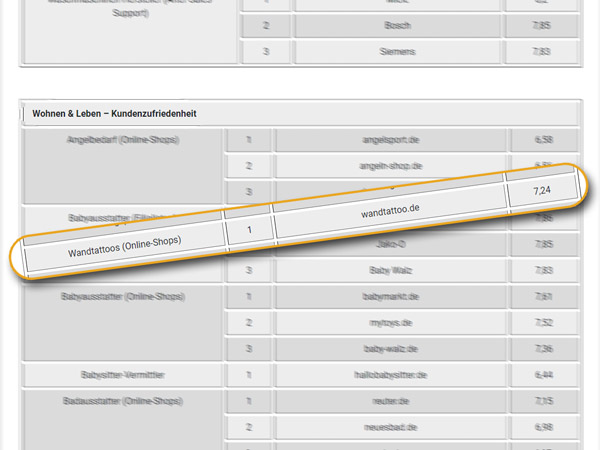 In der Rubrik Kundenzufriedenheit konnte Wandtattoo.de gewinnen