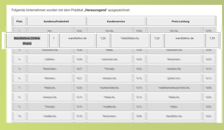 Das Jahr 2022 beginnt gut für uns. Wir wurden mit dem Shop Wandtattoo.de in den Kategorien Kundenzufriedenheit und Preis-Leistungs-Verhältnis mit dem Deutschen Kunden Award 2021/22 ausgezeichnet.